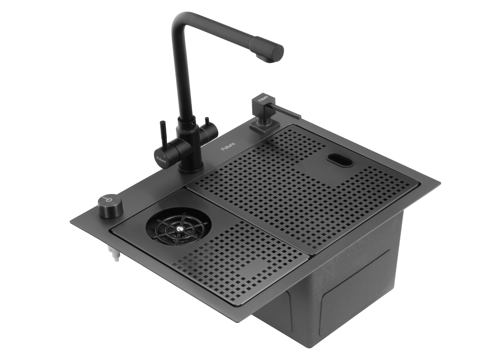 21-inch glass rinser sink with integrated rinser system and brush finish, designed for modern kitchens and café-style setups.