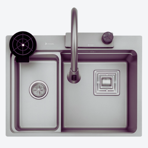 Premium FRS Series stainless steel kitchen sink with Decore-Satin finish and integrated accessories.