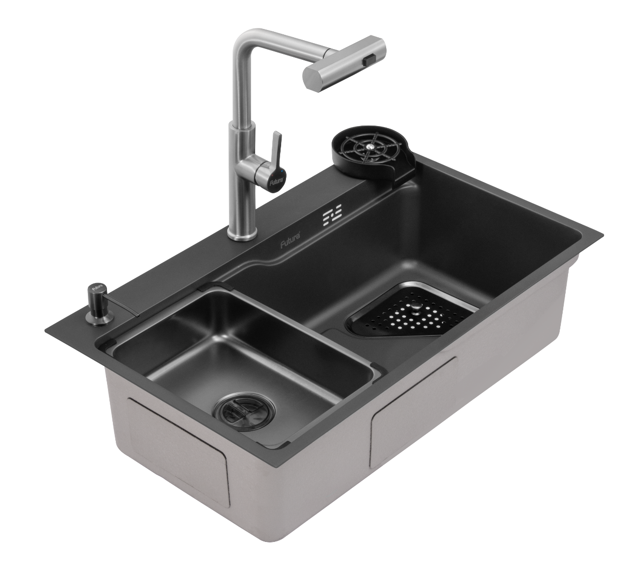 30-inch stainless steel glass rinser sink with integrated rinser system and workstation layout in Grey finish.