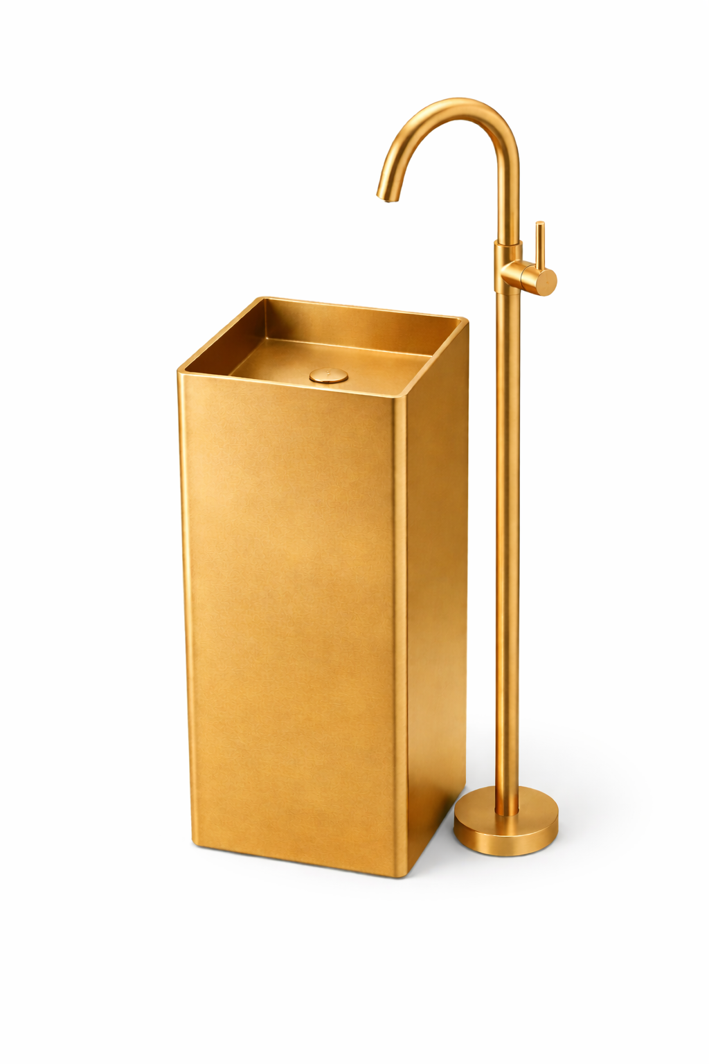 Upgrade your bathroom with a gold square standing wash basin with faucet. Elegant design, corrosion-resistant, perfect for luxury interiors.