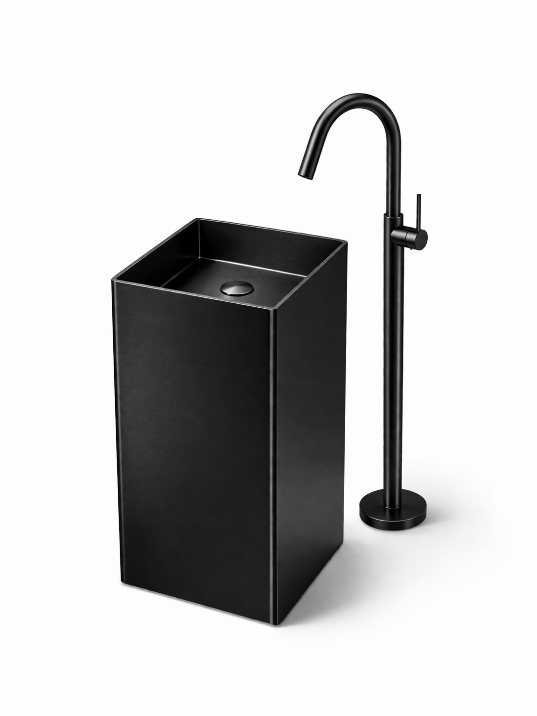 Buy square standing wash basin with faucet in gun black finish. Stylish, durable, and perfect for modern bathrooms and luxury interiors.