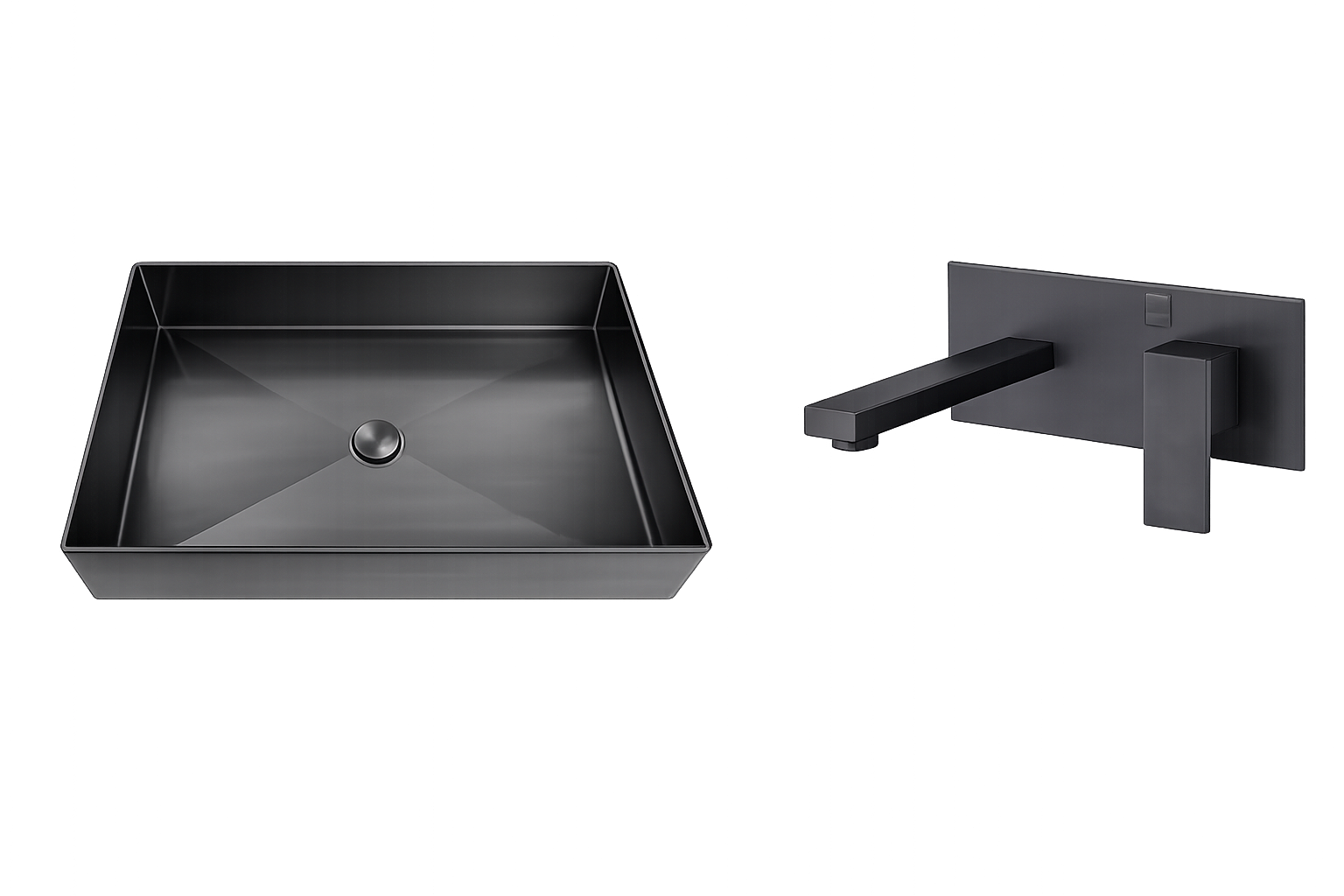 Shop square wall mount wash basin with faucet in gun black finish. Space-saving, stylish, and ideal for modern bathrooms and compact spaces.